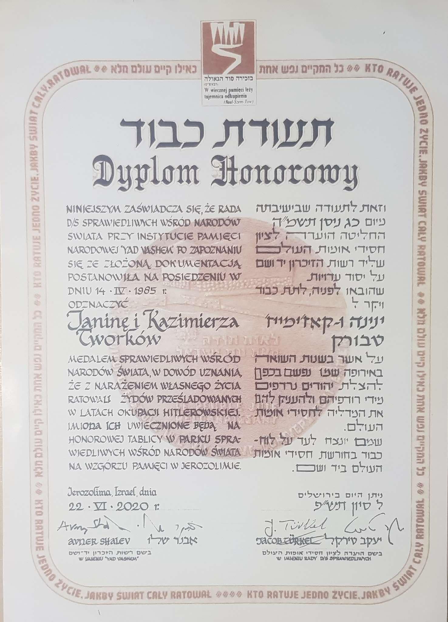 Państwo Janina i Kazimierz Tworkowie za swoje poświęcenie otrzymali dyplom wraz z Medalem Sprawiedliwy Wśród Narodów Świata. Ich czyn upamiętnia zasadzone drzewo wraz z imienną tabliczką w Instytucie Yad Vashem w Jerozolimie. Na Medalu znajduje się inskrypcja: „Kto ratuje jedno życie, ratuje cały świat”.