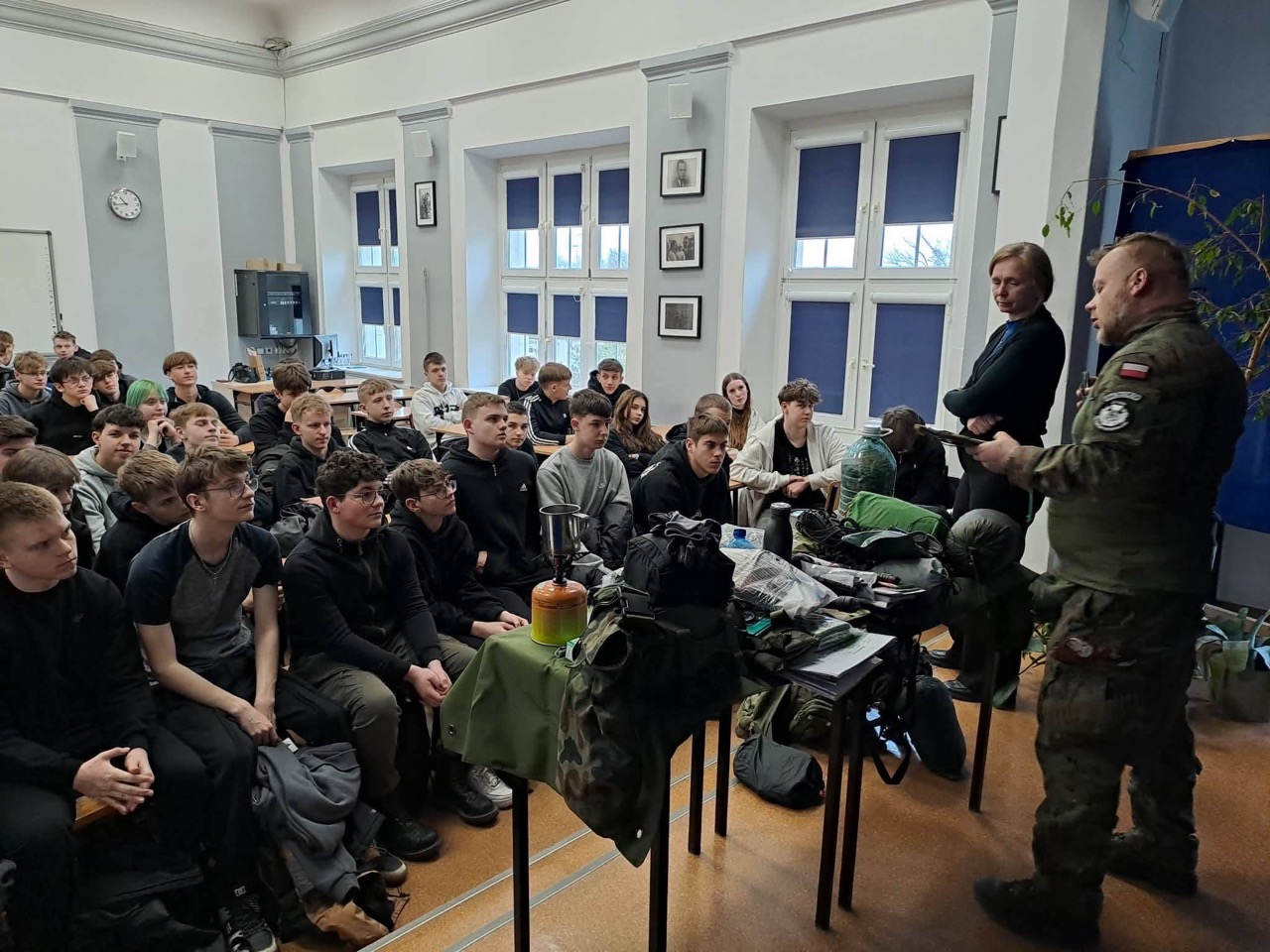 9 kwietnia 2026 r. w naszej szkole odbyły się zajęcia survivalowe dla uczniów technikum i liceum ogólnokształcącego, przygotowane przez przedstawicieli Jednostki Strzeleckiej 1031 Piotrków Trybunalski.