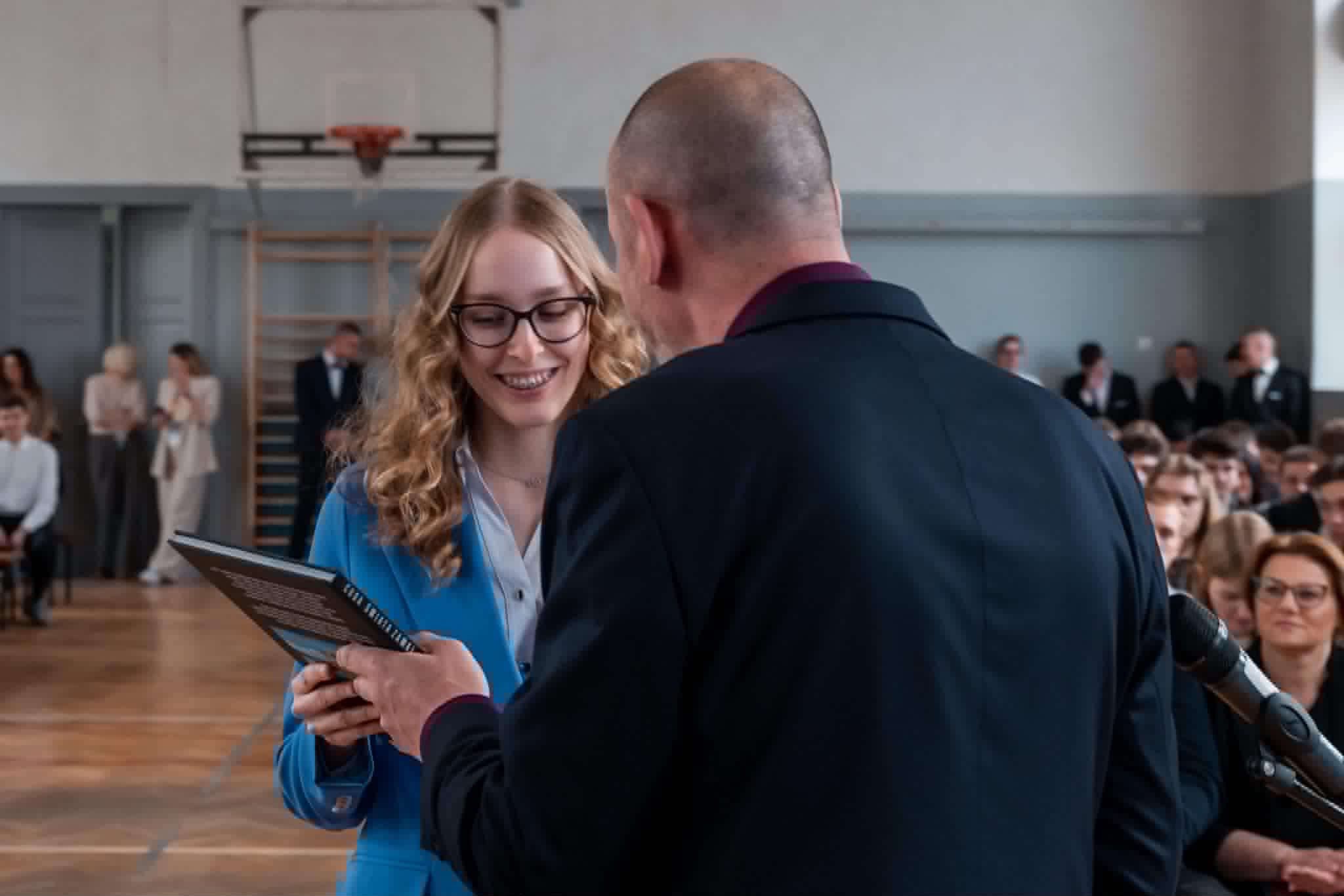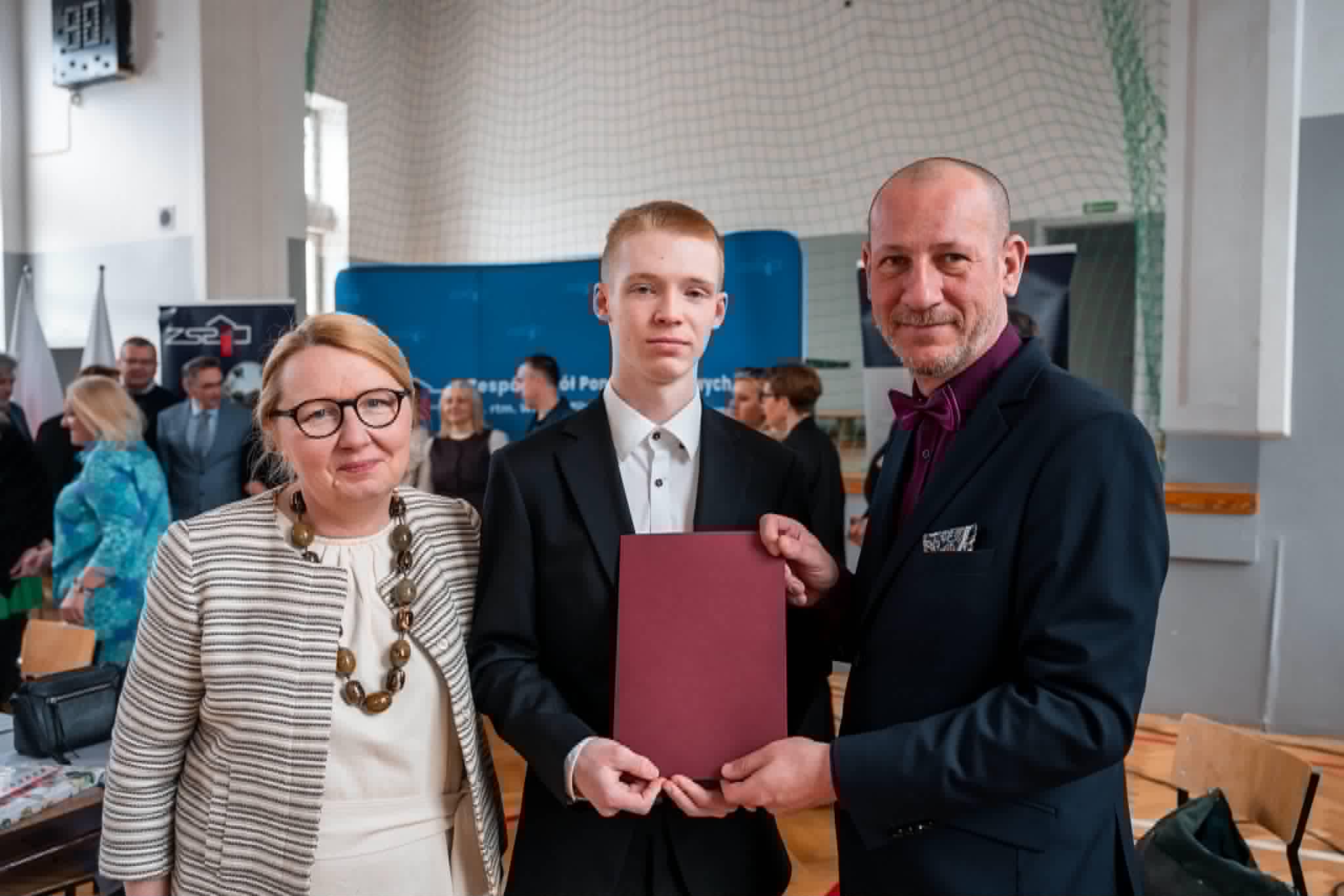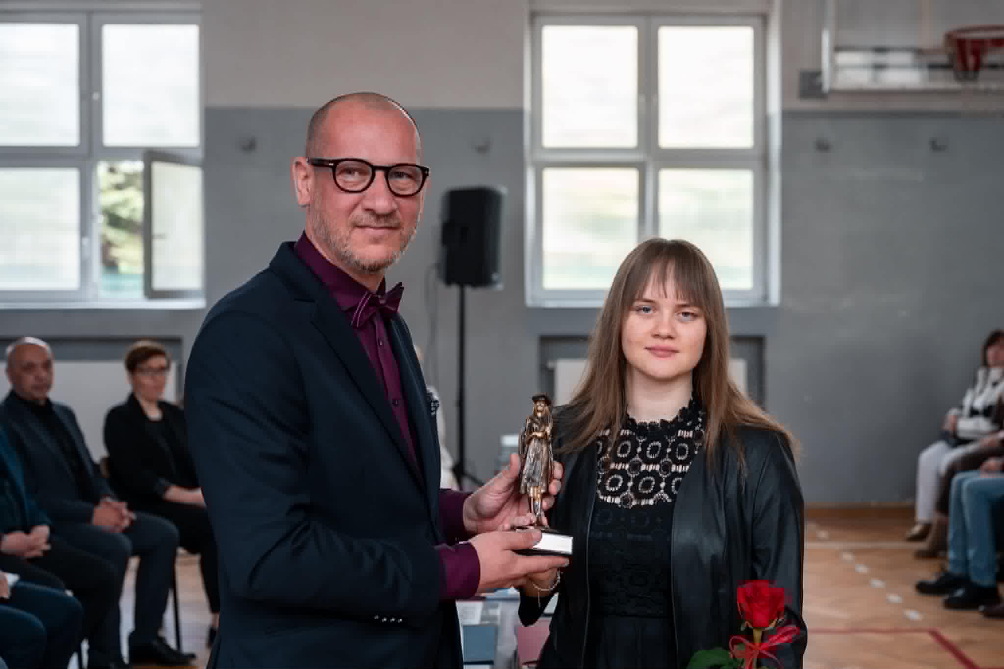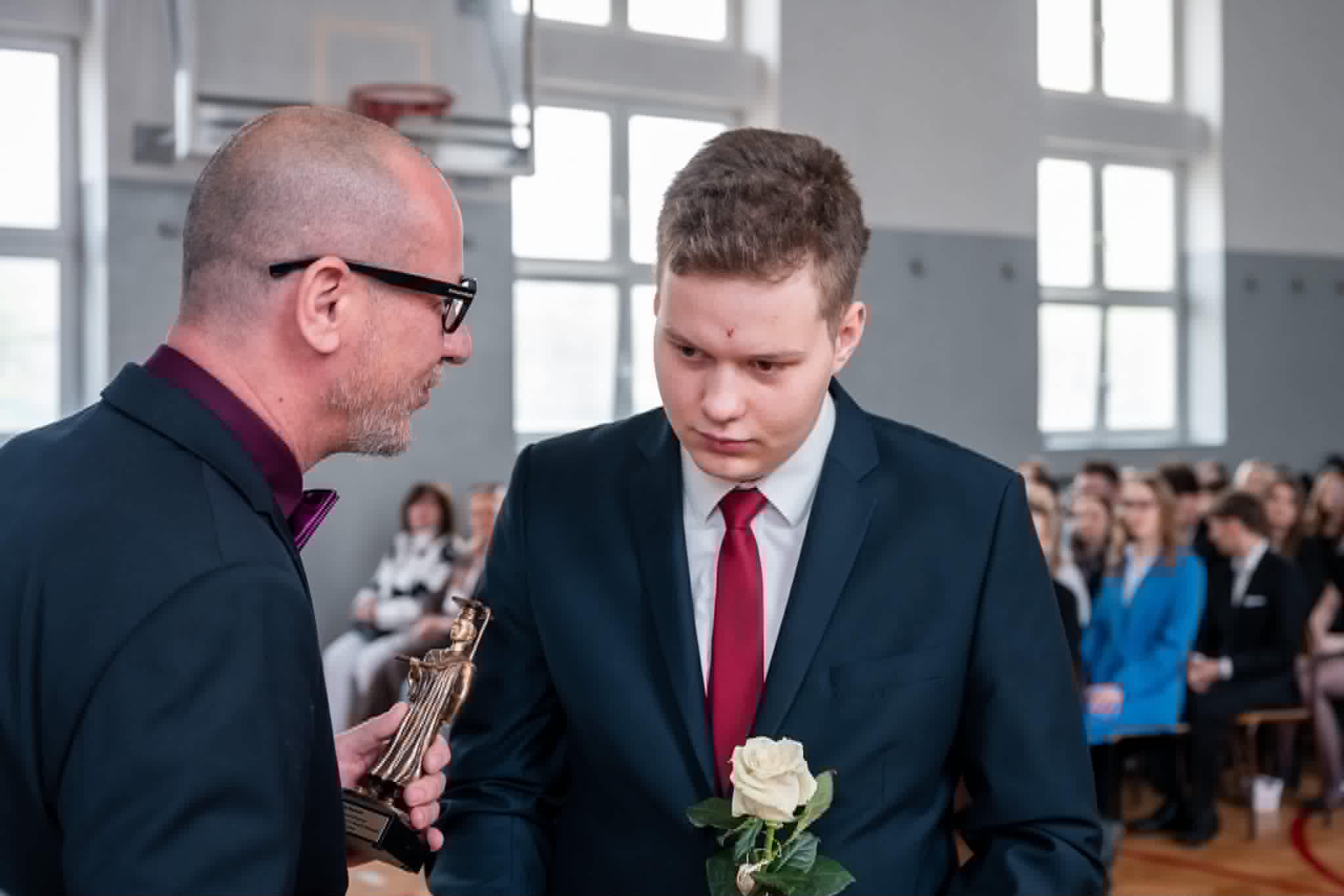 Następnie wręczył statuetki za wybitne osiągnięcia w nauce, które otrzymali: uczeń technikum Grzegorz Pawlak z klasy 5ti1 oraz uczennica liceum Zuzanna Mastalerz z klasy 4B.