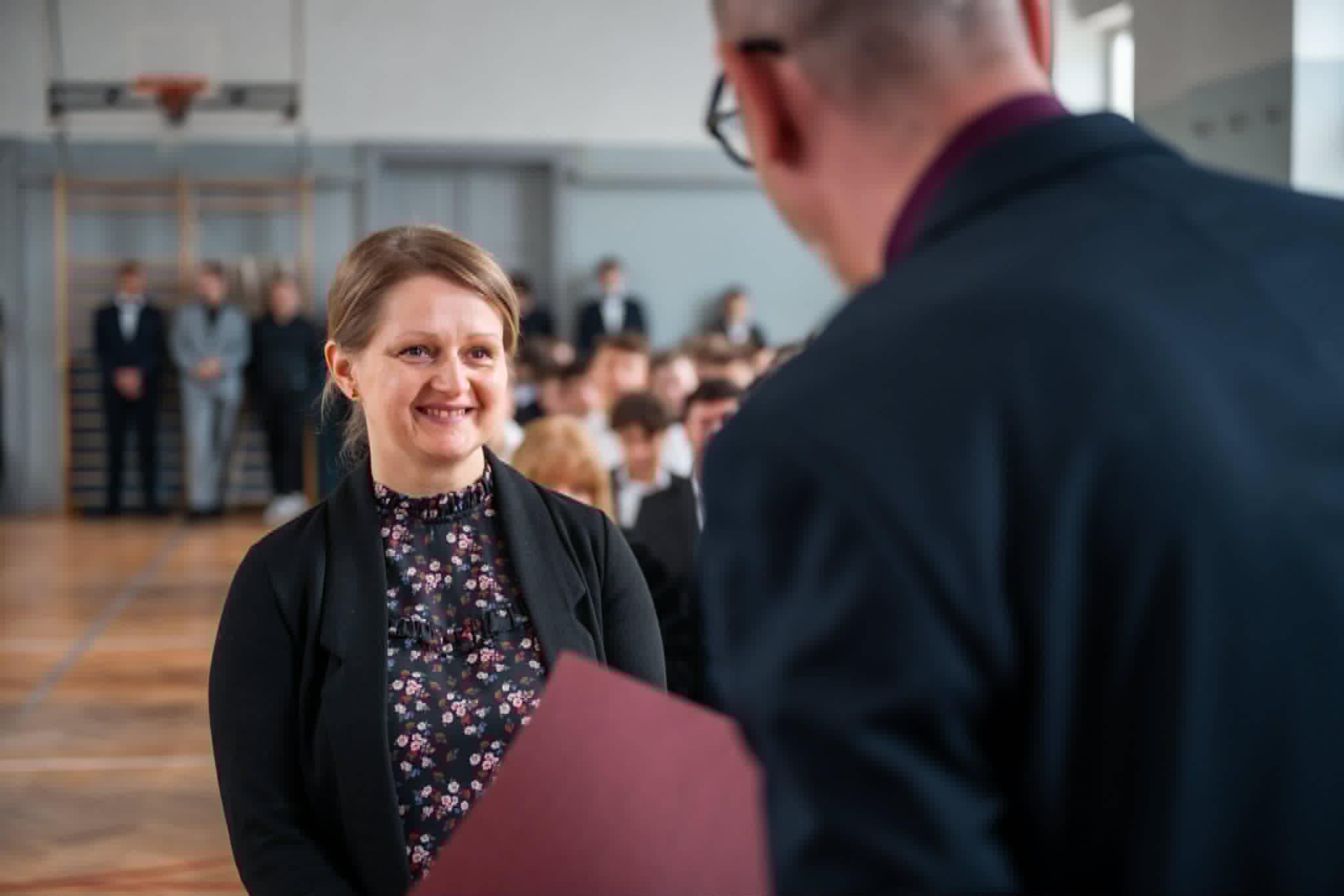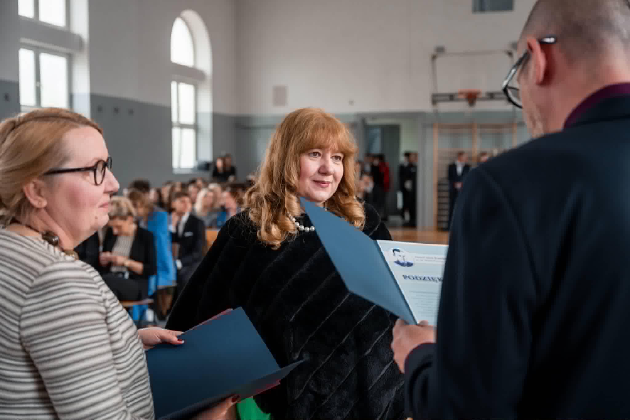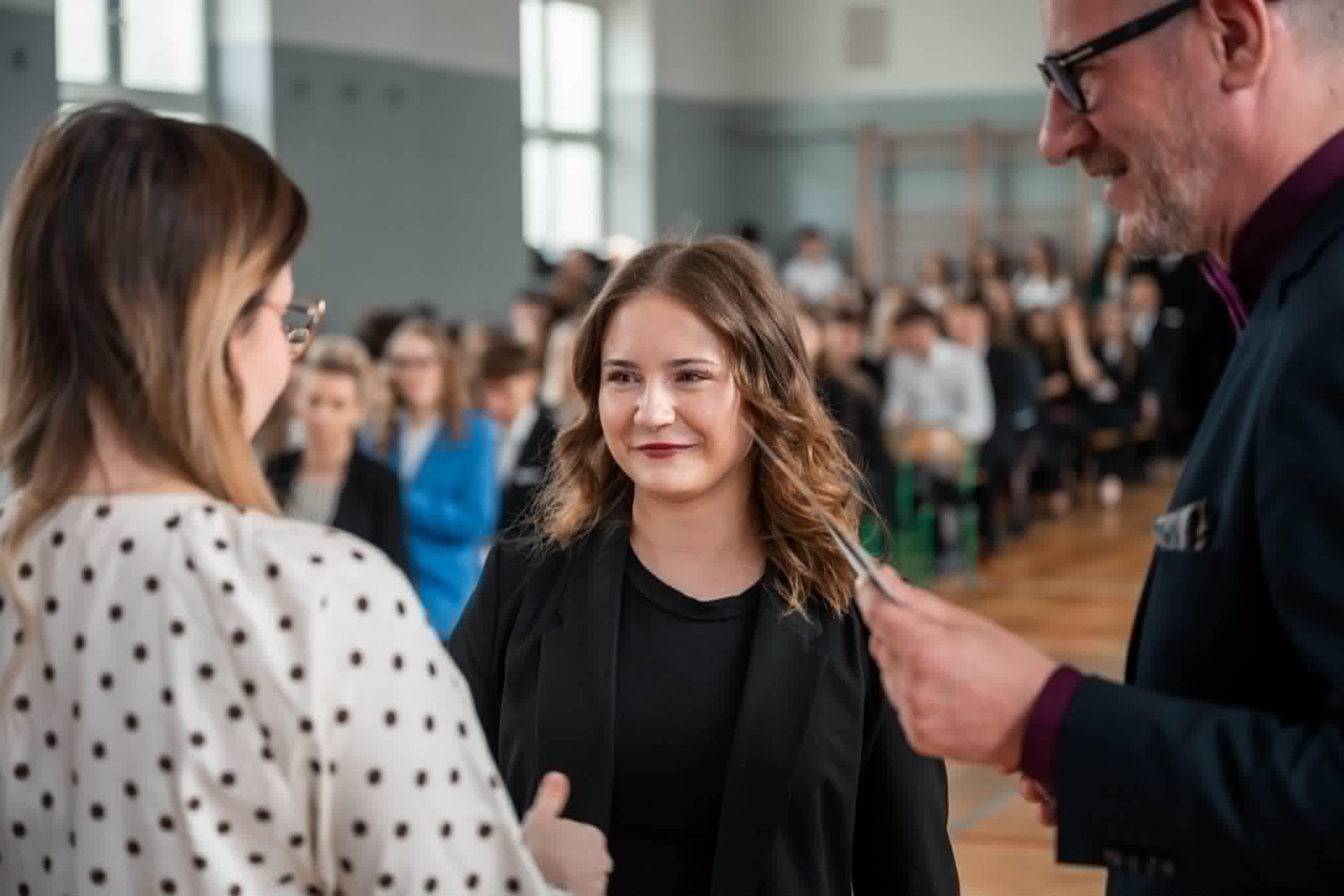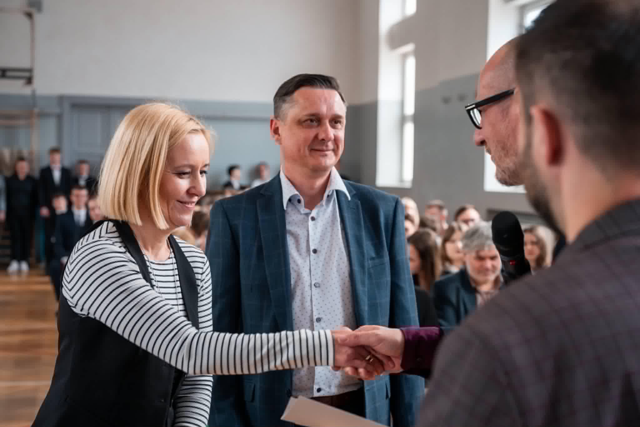 Następnie wręczył statuetki za wybitne osiągnięcia w nauce, które otrzymali: uczeń technikum Grzegorz Pawlak z klasy 5ti1 oraz uczennica liceum Zuzanna Mastalerz z klasy 4B.